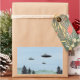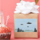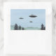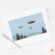 Aquarell, Stift und Tinte, Farbstift gezeichnet von drei sauceren UFOs über den Bergen.