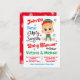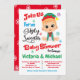 Ugly Sweater Baby Dusche Einladung. Ein Baby in seinem Weihnachtspulli gekleidet, Windeln und Elfhut. Farbenfrohe Schriftart und Schneeflocken.