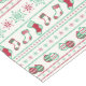 Ein Tischläufer mit einem sich wiederholenden Muster im Hintergrund, in einem hässlichen Weihnachtspulli-Stil. Das Muster besteht aus Socken, Weihnachtsbällen, Sternen und Schneeflocken. Mit wiederholtem frohen Weihnachtstext in rot. Spaß und Feierlichkeit.
