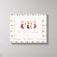 Leinwand Kunst mit einem sich wiederholenden Muster im Hintergrund, in einem hässlichen Weihnachtspulli-Stil. Das Muster besteht aus Socken, Weihnachtsbällen, Sternen und Schneeflocken. Mit wiederholtem frohen Weihnachtstext in rot. Spaß und Feierlichkeit. Oben platziert ist ein weißes Rechteck mit einem Imitat goldenen Rahmen, innen ist eine Illustration von altmodischen hängenden Strümpfen und dem Text: Frohe Weihnachten.