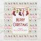Ein Wein-/Bieretikett mit einem sich wiederholenden Muster im Hintergrund, in einem hässlichen Weihnachtspulli-Stil. Das Muster besteht aus Socken, Weihnachtsbällen, Sternen und Schneeflocken. Mit dem sich wiederholenden frohen Weihnachtstext in rot. Spaß und Feierlichkeit. Oben platziert ist ein weißes Rechteck mit einem goldenen Rahmen in Imitaten, innen ist eine Abbildung von altmodischen hängenden Strümpfen. Frohe Weihnachten und dein personalisierter Text drinnen. Alle Texte können bearbeitet werden.
