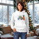 Weiße Katze mit einem hässlichen Weihnachtspullover, die sich über sein Aussehen wundert.