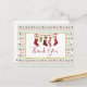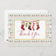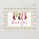 Weihnachts-Party Einladung mit einem sich wiederholenden Muster im Hintergrund, in einem hässlichen Weihnachtspulli-Stil. Das Muster besteht aus Socken, Weihnachtsbällen, Sternen und Schneeflocken. Mit dem sich wiederholenden frohen Weihnachtstext in rot. Spaß und Feierlichkeit. Oben platziert ist ein weißes Rechteck mit einem Imitat goldenen Folie, innen ist eine Abbildung von altmodischen hängenden Strümpfen und Dankeschön Sie innen geschrieben. Nachricht auf der Rückseite können Sie personalisieren.
