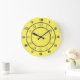 Römische und arabische Ziffern in den äußeren Ringen. Minute Hashmarken auf dem inneren Kreis. Zahlen in metallisch aussehenden silbernen Farben, Trennringe in dunkelgrau, alles auf einem fröhlichen gelben Hintergrund.