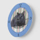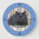 Set-Bild zu FILL, war NEIN. Das Ändern des Bildes wird zu RIESIGEN. Schwarze Katze entspannt sich auf gestreiften Kissen. Die Kissen sind grün, rot, beige und weiß, senkrechte Streifen. Der äußere Rand der Uhr passt zum Rot in den Kissen. Unter der Katze steht der Text "Zeit zum Entspannen!".