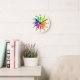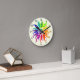Die Farben eines Standardfarbrads sind in stilisierten Blätter dargestellt, die nach den Ziffern auf der Uhrfläche reichen. Der Hintergrund ist blassgelb. Zwei farbige Blätter (eine große, eine kleinere) sind etwas außerhalb des Set. Warme Farben (gelb, orange, rot) kennzeichnen die Nachmittagsstunden. Coole Farben (lila rosa, grün) kennzeichnen den Abend. Großartiges Geschenk für den visuellen Künstler.