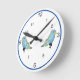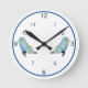 Blaue Vögel, die auf den Nummern 8 und 4 sitzen, ihre Schnallen zeigen auf 9 und 3. Dunkelblauer Kreis markiert den äußeren Rand der Uhr.