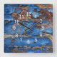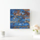 Die Wanduhr ist mit blau gestrichenen Imitaten aus Holz gestaltet.