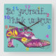Auf dieser Uhr ist ein Gemälde von Anne Ormsby von einem lustigen Schuh. Der Slogan darauf lautet: "Denk selbst an einzigartig."