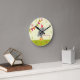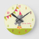 Eine Uhr, die eine Abbildung eines Zirkuselefanten zeigt, der auf einer Plattform mit einem rosa Hut stehend ist. Personalisieren Sie mit Ihrem Namen unten rechts von Elefanten.
