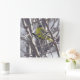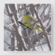 Gelber Vogel sitzend in bloßen Zweigen eines Kirschbaumes. Hellgelbe Federn von Hals und Körper heben sich im Wintergrauen der Äste hervor. Weiße Ziffern haben einen Schlagschatten.