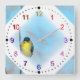Gelber Vogel erfasst einen vertikalen Ast. Die weiße Seite der Uhr hat eine Diamantvignette in der Mitte, die es dem Bild des Vogels ermöglicht, so zu erscheinen, als ob er auf dem weißen Rahmen steht. Zahlen sind Regenbogenfarben (12 sind gelb wie der Vogel). Die Minuten sind mit kleinen Ziffern um den äußeren Rand herum markiert.