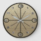 Modernistischer Stil mit metallisch aussehenden Zahlen. 12, 3, 6 und 9 sind mit den Endpunkten der Kreuzung umschlossen. Andere Ziffern haben dünne, kürzere Linien, die auf sie zeigen. Hintergrund ist eine beige Leinenstruktur.