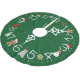 Weiße Vintage Uhr auf grünem Hintergrund mit lustigen Weihnachtselementen und Schneeflocken. Die Hintergrundfarbe kann geändert werden.