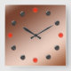 Eine nummerlose Uhr, die in unserem "neuen" Haus in den 1960er Jahren von einer Wanduhr inspiriert wurde. Rote Bälle sitzen an den Positionen 12, 3, 6 und 9, schwarze Bälle an den anderen Punkten. Hintergrund ist metallisch.