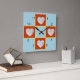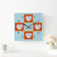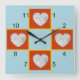 Herzförmige Rahmen auf blauem Hintergrund. Familienfotos oder ? Zeigt in den 12, 3, 6 und 9 Flecken auf dieser "Patch-Arbeit Quilt"-Uhr. Ihre quadratischen Bilder werden in den roten, herzförmigen Rahmen platziert. Der Hintergrund kann nach Ihren Wünschen angepasst/bearbeitet werden. (Standardeinstellung für hellblau)