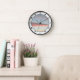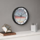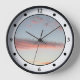 Weiche Wolken mit Sonnenuntergangsfarben, blass blauer Himmel. Ähnelt dem Blick durch ein Bullauge. Fett schwarze Ziffern mit 12, 3, 6 und 9, wobei Punkte andere Ziffern markieren.