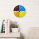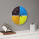 Quadrate in vier Farben: Ecken treffen sich in der Mitte der Uhr. Blau, gelb, orange und schwarz bedecken die Stunden des Morgens, Nachmittags, Abends und der Nacht und haben dreidimensionale Ausseher. Weiße Zahlen zeigen auf den Fliesen.