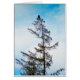 Ein Foto eines American Bald Eagle hoch oben auf einem hohen Pine Tree. Im Hintergrund ist ein blauer Himmel mit scheußlichen Wolken. Auf dem Baum und seinen Ästen finden sich Spuren von Sonnenlicht und Schnee. Bild Copyright 2017 Kimberly J Tilley.