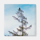 Ein Foto eines American Bald Eagle hoch oben auf einem hohen Pine Tree. Im Hintergrund ist ein blauer Himmel mit scheußlichen Wolken. Auf dem Baum und seinen Ästen finden sich Spuren von Sonnenlicht und Schnee. Bild Copyright 2017 Kimberly J Tilley.