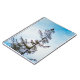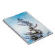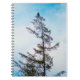 Ein Foto eines American Bald Eagle hoch oben auf einem hohen Pine Tree. Im Hintergrund ist ein blauer Himmel mit scheußlichen Wolken. Auf dem Baum und seinen Ästen finden sich Spuren von Sonnenlicht und Schnee. Bild Copyright 2017 Kimberly J Tilley.