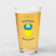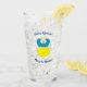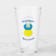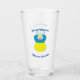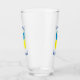 Die ukrainische Flagge ist oben blau und unten gelb. Hier haben wir einen Engel in der blau-gelben Flagge der Ukraine gekleidet. Oben, in blauen Buchstaben liest SLAVA UKRAINI. Unten, in der gleichen Farbe sind die Worte GLORY TO UKRAINE. Hier sehen Sie sowohl vor als auch hinter einem Trinkglas.