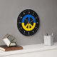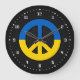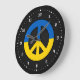 Large clock with a peace symbol in the colors of the Ukrainian flag on a black background