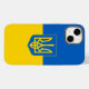 iPhone 14 Fall mit der Flagge der Ukraine, eine blaue und gelbe Flagge mit dem ukrainischen Wappen (Emblem) mit einem Dreieck in der Mitte