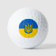 Golfbälle mit der Flagge der Ukraine, eine blaue und gelbe Fahne mit dem ukrainischen Wappen (Emblem) mit einem Dreieck in der Mitte
