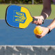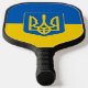 Pickleball Paddle mit der Flagge der Ukraine, eine blaue und gelbe Flagge mit dem ukrainischen Wappen (Emblem) mit einem Dreieck in der Mitte