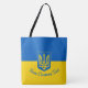 Tote Tasche mit der Flagge der Ukraine, eine blaue und gelbe Flagge mit dem ukrainischen Wappen (Emblem) mit einem Dreieck in der Mitte, und eine benutzerdefinierte Textvorlage für Ihre Nachricht.