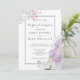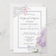 Skizzierte und künstlerisch bemalte lila Blüten in trendigen Ultra-violetten Farbtönen und sanft-grau-romantisch rahmen Ihre Hochzeitsfeier-Einladung. Umkehrt zu subtilen lila-verschleierten Floretten und grauen gezeichneten Blüten, die Ihre Initialen umschließen. Frühjahrsheirat mit Lavendelblüten, cremig rosa, weiß und taube graue Farben.