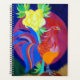 Der klassische extravagante Hahn und einer der häufigsten Vögel in Umbrien, vor allem auf dem Land in Umbrien, wo Jean lebt. Farbig und mit einer Blume, die Jean erfunden hat, und der üblichen großen Sonne im Hintergrund. Die Sonne auf diesem Bild ist lila. Der stehende, hohe Hahn ist in hellen Farbtönen gehalten, mit vorwiegend blauen, lila und orangefarbenen Federn. Ein Hahn ist auch eines der Zeichen des chinesischen Zodiaks.