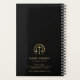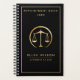 Modernes elegantes Anwaltszettel/Planer mit goldenem Symbol der Gerechtigkeit auf schwarzem Hintergrund und Name/Titel auf der Vorderseite. Personalisieren Sie Ihre Daten auf der Rückseite.