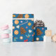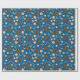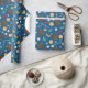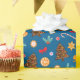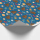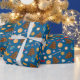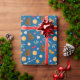 Papier mit einem Neujahrsmuster, niedliche Bilder von Bonbons, Lollipops und Lebkuchengebäck, Bogen und Blätter auf blauem Hintergrund.