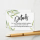 Behalt deinen Hochzeitsgästen in der Schlaufe mit all deinen Details mit diesen modernen, zweiteiligen Hochzeitssteckkarten. Im Hintergrund wurden Spuren von grünen Aquarellkräutern hinzugefügt, die sich über die äußeren Ränder sowohl der Vorder- als auch der Rückseite der Karten verteilten. Ein lässiges Typografie-Textüberlagerungslesen "Details" wurde mit einem modernen handgeschriebenen Schriftart entworfen. Verwenden Sie die Vorlagenfelder, um diese Beilagenkarten mit Ihren persönlichen Daten anzupassen. Alle Ebenen wurden separat hinzugefügt und links, um Ihnen eine maximale Kontrolle zu geben. Editieren Sie diesen Look so viel, wie Sie brauchen und zögern Sie nicht, mir zu erreichen, wenn Sie Hilfe beim Prozess benötigen. // 105 // Designed by Melody Watson for Paper Muserie.