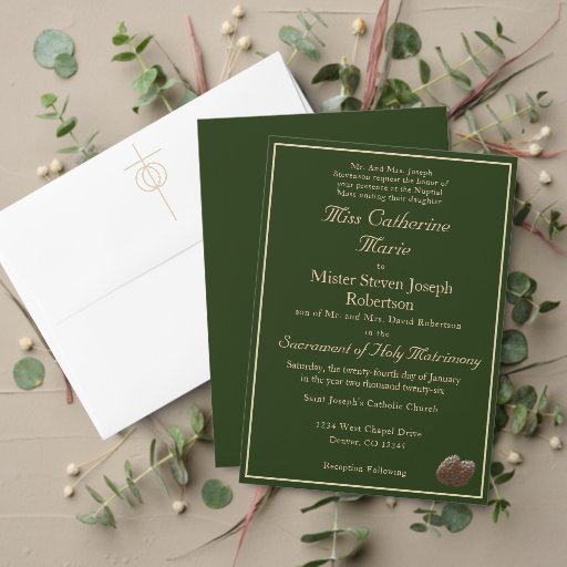 Das katholische Winterhochzeitdesign zeichnet sich durch das passende Format für eine Gehäusekarte aus, die teilweise durch das Bild eines Winterkranzes gerahmt ist. Farbe - Champagner Rosa und Sepia. Text ist schwarz. Sehr formell und elegant.