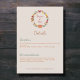 Eine Umschließungskarte mit Details und einer Zeitleiste von Veranstaltungen, die den Gästen Ihrer Hochzeit zum Thema Natur und Wald zugeschickt werden. Es ist mit einer Kranz-Abbildung inklusive Ahorn, Buche, Eiche und Hasel-Blätter, Pilz, Eiche, Kürbis, Kastanien und Nüsse in Herbstfarben.