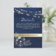 Elegante, moderne, rustikale Holz marineblaue Hochzeitskarte mit Website, Vintage goldfarbene Blumenspitze und Lichter an der Saite.