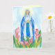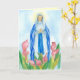 Eine Begrüßungskarte zu Ehren des Unbefleckten Herzens von Maria und des Festes der Erlösung in August, die mit einer handgemalten Wasserfarbe von Unsere Dame mit einem Hauch goldenen Lichts von ihrem Kopf und weich rosa Calla lily Blume dekoriert ist. Im Inneren ist ein hellgelber Farbton mit Text, den Sie nach Ihren Wünschen bearbeiten können.