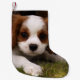 Unbekümmerter Königcharles Spaniel-Welpe hinter Kleiner Weihnachtsstrumpf