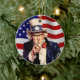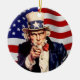 Rundschmuck mit einem Vintagen Bild von Uncle Sam aus den 40er Jahren auf der amerikanischen Keramik. Die Rückseite ist mit optionalem Text einsehbar. In den SPEZIELLEN TOUCHS finden Sie die gesamte Patriotic 40s Ornament Kollektion | Abschnitt Gastgeschenke.