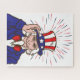 Ein Puzzle mit einem Bild von Onkel Sam und Feuerwerk hinter ihm.