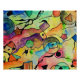 Abstrakte Mischmedien auf Aquarellpapier, bestehend aus Aquarellfarbe und Tinten aus einer lebhaften Reihe geometrischer Formen, einschließlich Kreisen, Dreiecken und Quadraten, die Objekte darstellen, die vom Wind über den Himmel geworfen werden.