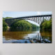 A steel arch bridge spans over a calm river, surrounded by lush green trees and a clear blue sky. The water reflects the bridge's structure, creating a serene and picturesque scene. Photo of the Connecticut River flowing under The French King Bridge by Gill Massachusetts.