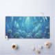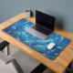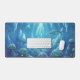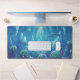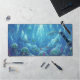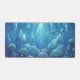 A mesmerizing underwater scene featuring a thriving alien civilization deep beneath the ocean. Transparent domes house glowing green aliens surrounded by coral, jellyfish, and swimming whales. Light filters down through the water, illuminating the crystal-blue seascape and blending sci-fi imagination with aquatic serenity.