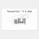 Ein zeichn einer Skyline der Stadt, begleitet von einer ikonischen Linie aus "The Wasteland" von T. S. Eliot, veröffentlicht 1922. Das Gedicht ist öffentlich.