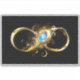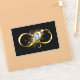 Gold, glänzendes Symbol der Unendlichkeit, mit einer Schmuckfeder mit türkisfarbenem Hintergrund dekoriert.