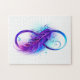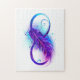 Unendliches Symbol mit einer schönen Feder, die in lila und blauen, hellen Farben auf weißem Hintergrund gemalt wurde.