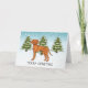 Desteis originelle Cartoon-Illustration eines niedlichen ungarischen Vizsla Rasse Hundes. Der Hund ist in einer Winterlandschaft mit drei grünen Tannenbäumen und fallendem Schnee untergebracht. Der Hintergrund ist ein blaues bis weißes Gefälle, das das Design des kalten Wintertages verleiht. Es gibt auch einen personalisierbaren Textbereich, der jetzt lautet: "Frohe Weihnachten".